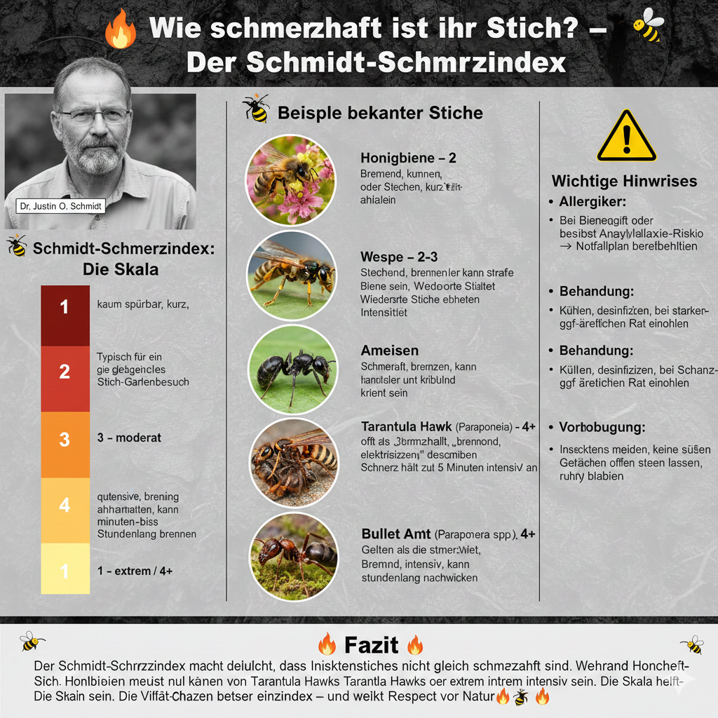 Der Schmidt-Schmerzindex macht deutlich, dass Insektenstiche nicht gleich schmerzhaft sind. Während Honigbienen meist nur kurz brennen, können Stiche von Tarantula Hawks oder Bullet Ants extrem intensiv sein. Die Skala hilft, die Vielfalt der Schmerzen besser einzuordnen – und weckt Respekt vor der Natur 🐝🔥.