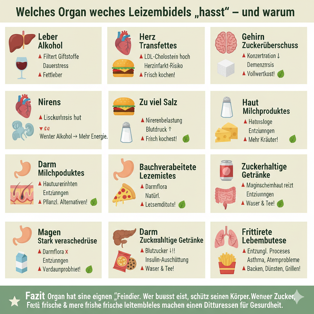 Unsere Organe arbeiten jeden Tag unermüdlich für uns. Doch bestimmte Lebensmittel können sie stark belasten – manchmal langfristig, ohne dass wir es sofort merken. Die Infografik zeigt auf einfache Weise, welche Nahrungsmittel für welche Organe problematisch sein können. Hier findest du die wichtigsten Erklärungen dazu: