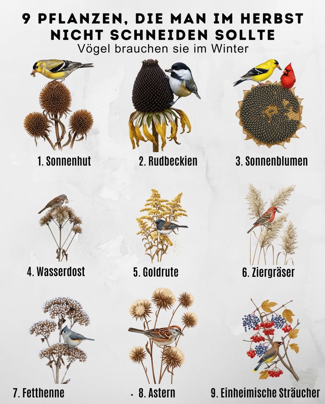 Im Naturgarten bleiben viele Stauden und Sträucher über den Winter stehen. Ihre Samenstände ernähren Vögel, die Stängel schützen die Horste vor Nässe und Frost, und das vertrocknete Laub dient Insekten als Unterschlupf. Erst im späten Winter bzw. sehr frühen Frühjahr (Februar/März), wenn keine starken Fröste mehr drohen, wird bodennah zurückgeschnitten. Hier die neun wichtigsten Kandidaten – mit Nutzen, Pflegetipp und Schnittzeitpunkt.