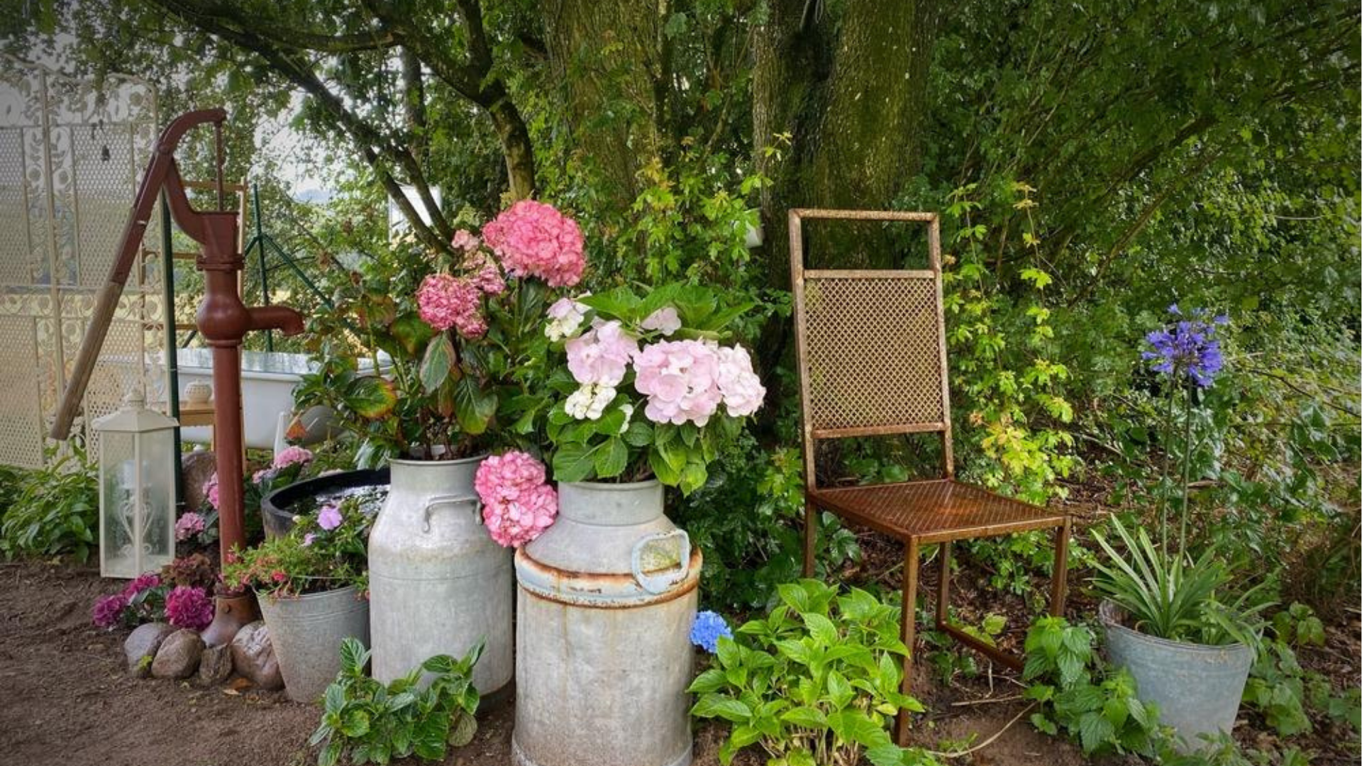 - Tipp: Stelle die Kannen auf einem Holzregal oder einer Bank auf, um eine rustikale Ausstrahlung zu erzielen. Du kannst auch mit unterschiedlichen Blütenfarben spielen, um das Arrangement noch lebendiger zu gestalten.
