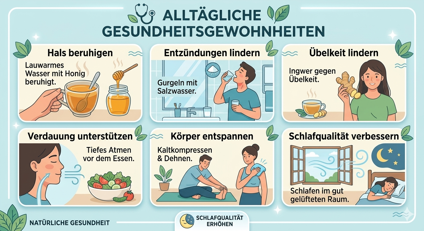 Lauwarmes Wasser mit Honig kann den Hals beruhigen, und Salzwasser-Gurgeln kann Entzündungen lindern.