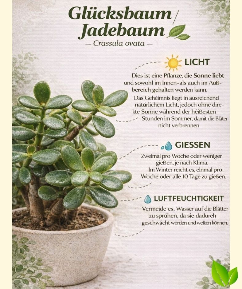 Zusätzliche Tipps: Der Glücksbaum speichert Wasser in seinen Blättern und kommt gut mit Trockenphasen zurecht. Regelmäßiges Drehen sorgt für gleichmäßiges Wachstum. Abgeknickte Blätter lassen sich leicht vermehren.