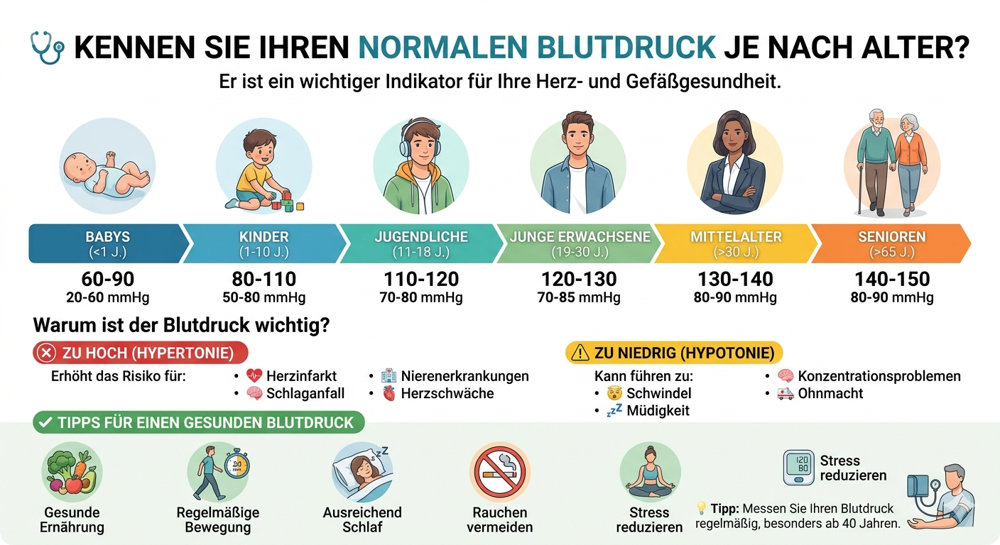 📊 In der Grafik oben sehen Sie die normalen Blutdruckbereiche nach Alter – von Babys bis zu Senioren.