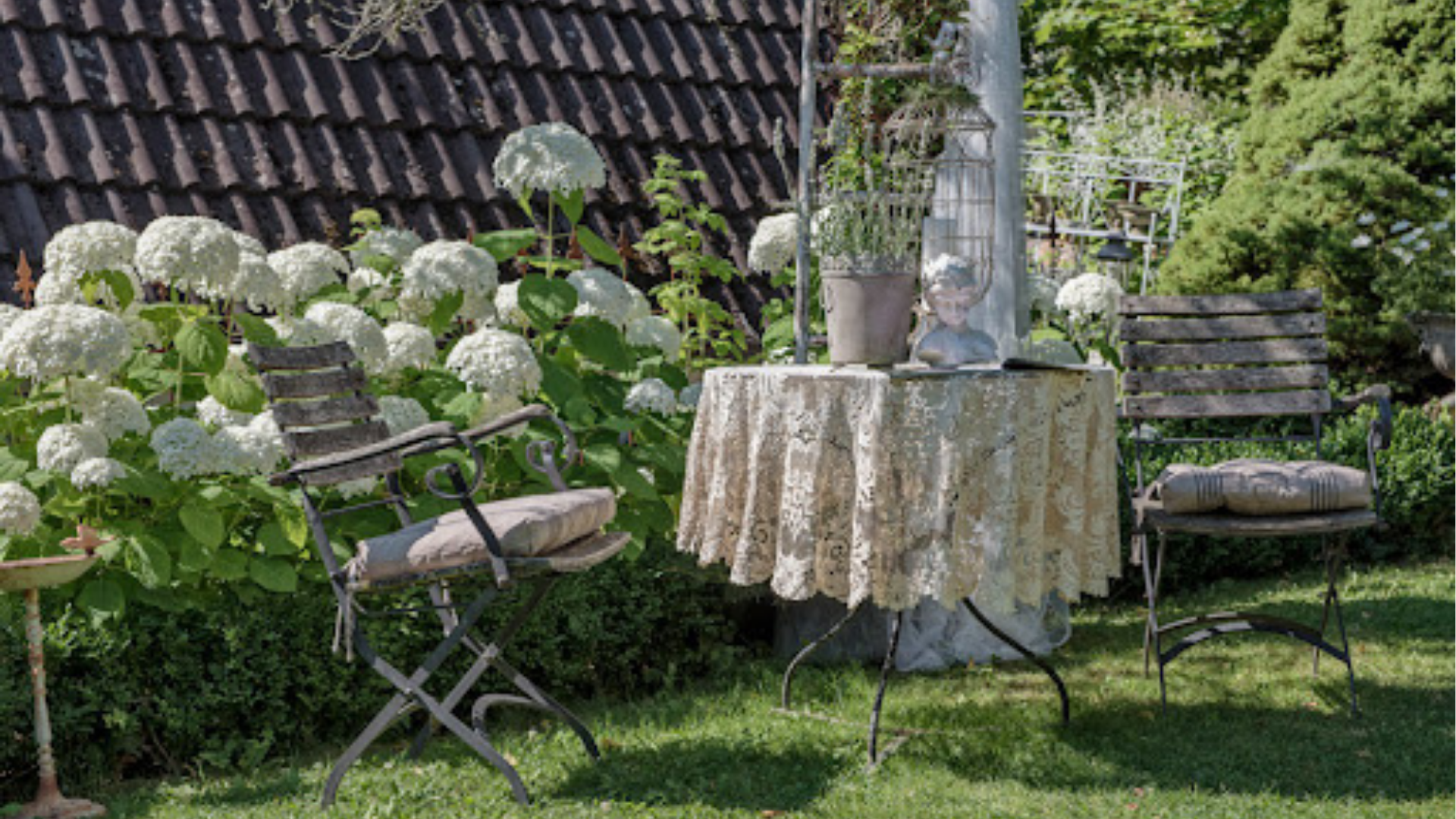 - Tipp: Ein Beet mit nostalgischen Blumen wie Hortensien oder wild wachsenden, bunten Wiesenblumen fügt eine verträumte, ländliche Atmosphäre hinzu.