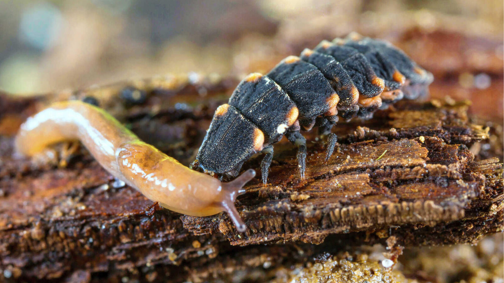 - Die Larve: Die unscheinbaren, grau-schwarzen Larven mit orangefarbenen Flecken sind gefräßige Jäger. Eine einzige Larve kann im Laufe ihrer Entwicklung bis zu 600 Blattläuse vertilgen.