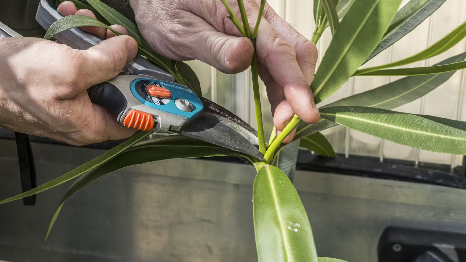 Tragen Sie beim Schneiden Handschuhe – alle Pflanzenteile des Oleanders sind giftig. Eine scharfe, saubere Gartenschere sorgt für glatte Schnittflächen, damit keine Krankheiten eindringen.