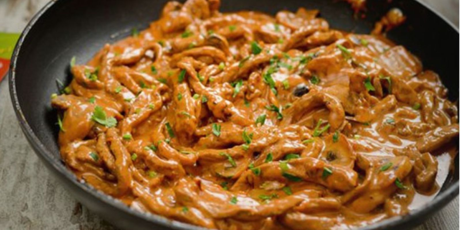 - Die gebratenen Schnitzelstreifen zurück in die Pfanne geben und vorsichtig in die Soße einrühren, damit sie vollständig mit der Soße bedeckt sind.