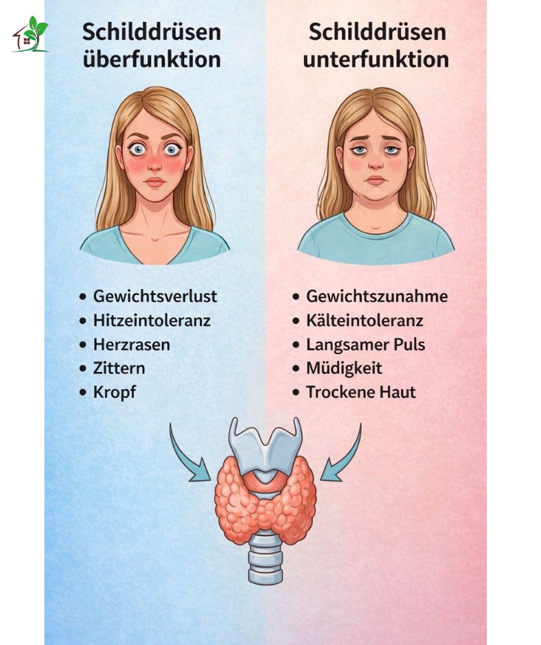 2️⃣ Überfunktion (Hyperthyreose): Typisch sind Nervosität, Gewichtsabnahme trotz Hunger, schneller Puls, Schwitzen, innere Unruhe.