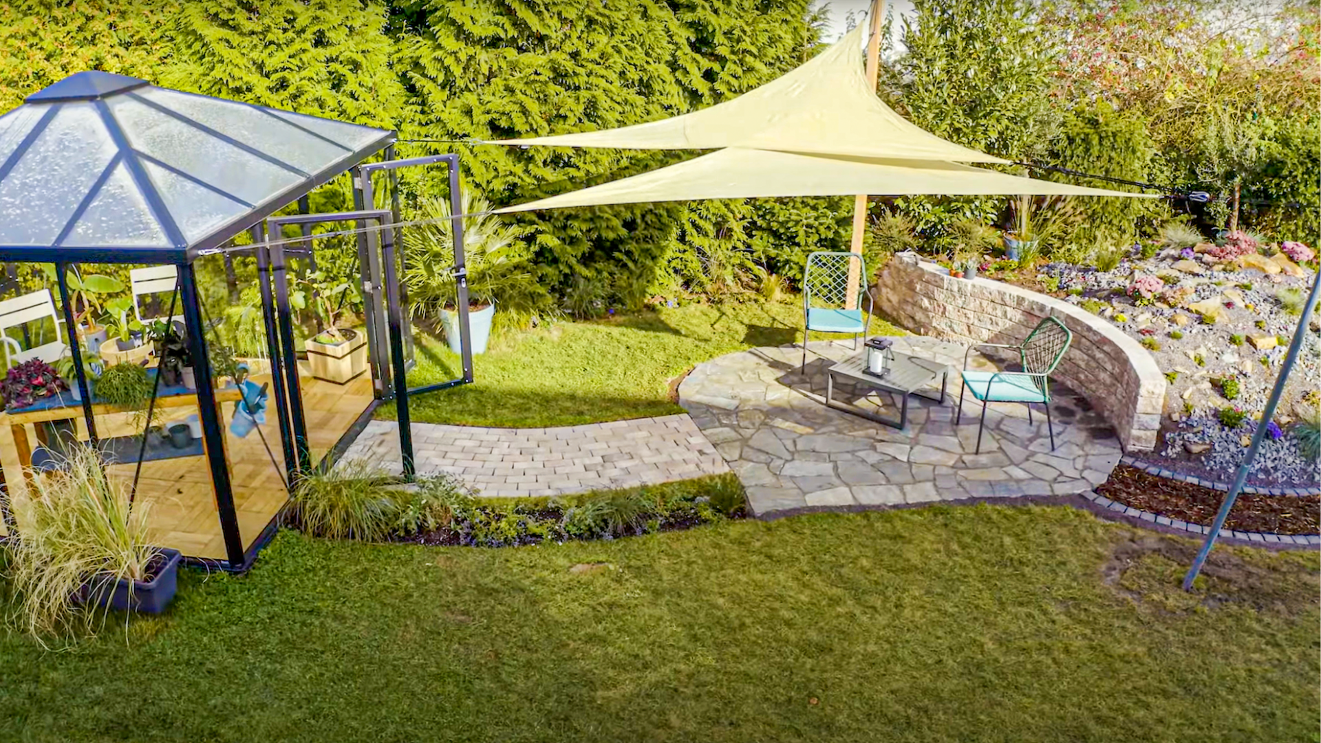 Ein Sonnensegel ist nicht nur praktisch, sondern auch ein Gestaltungselement. Kombiniere es mit anderen Materialien für ein harmonisches Gesamtbild: