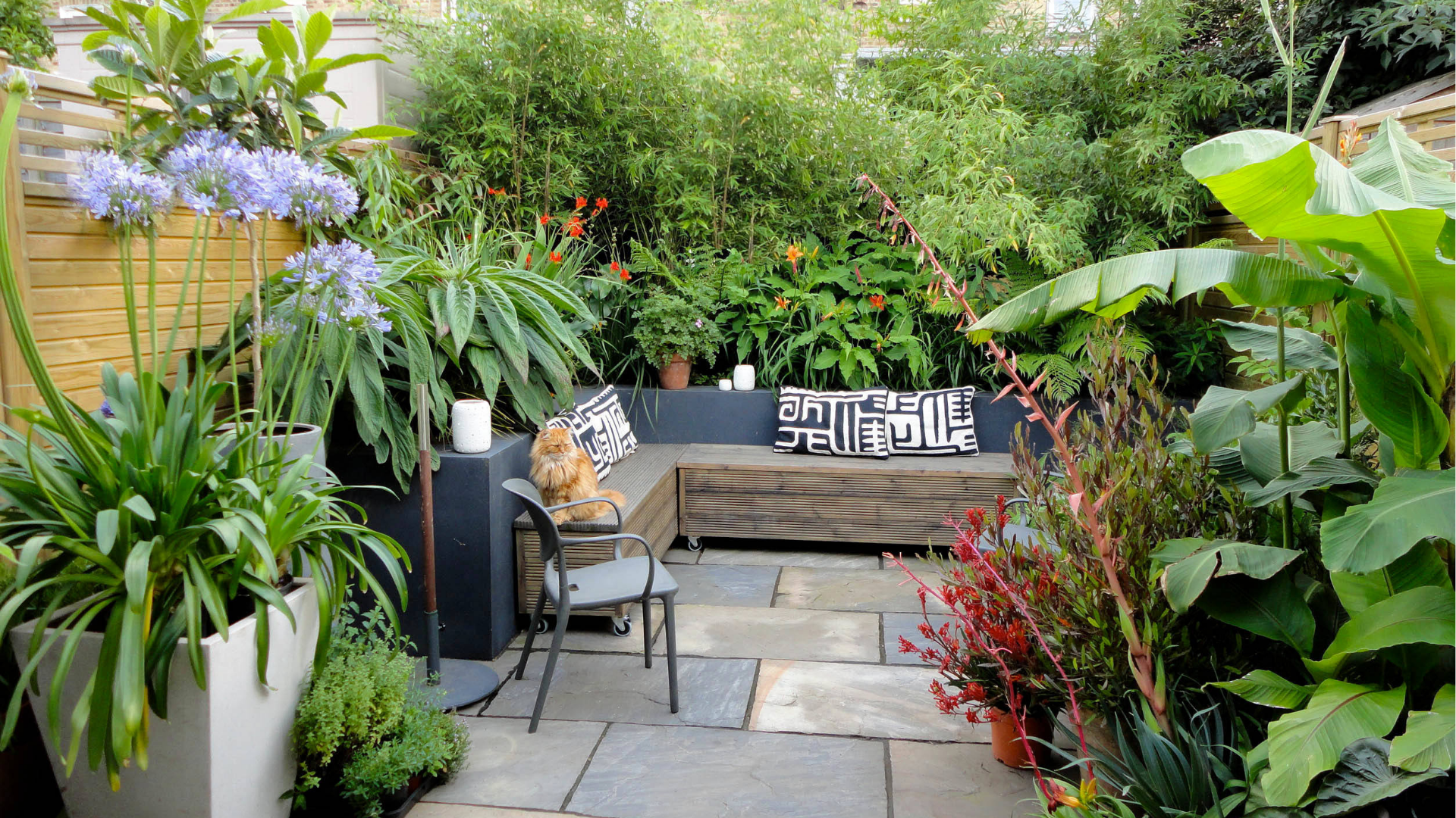 Ein Urban Jungle Garten lebt von Fülle, Kontrasten und natürlichen Materialien. Es darf ruhig etwas unordentlich aussehen – genau das macht den Charme aus.