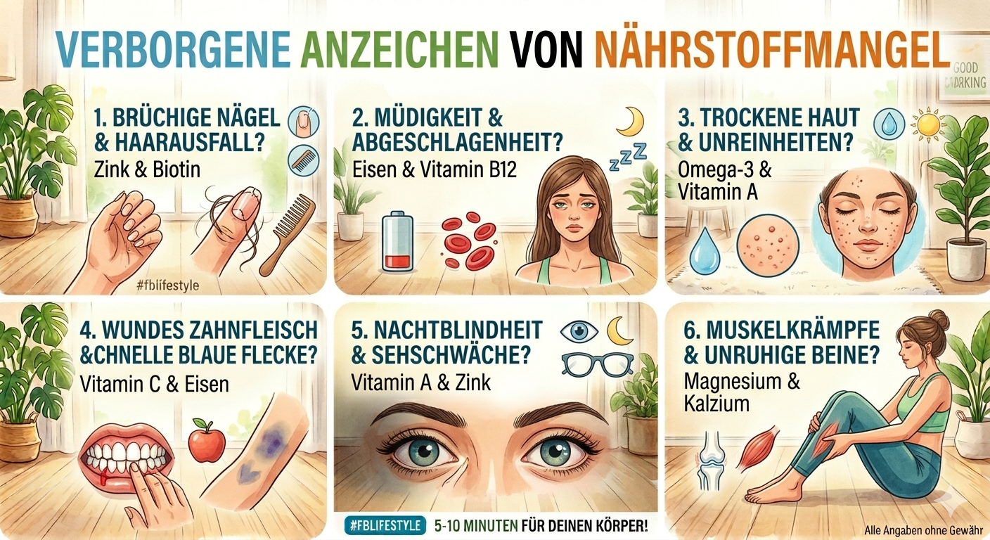 Unser Körper sendet oft kleine Signale, wenn ihm wichtige Nährstoffe fehlen. Frühzeitiges Ergrauen der Haare kann zum Beispiel auf einen Kupfermangel hinweisen. Trockene und rissige Haut kann ein Zeichen für Omega-3-Mangel sein. Wenn Wunden nur langsam heilen, fehlt dem Körper möglicherweise Zink. Auch ein schneller oder unregelmäßiger Herzschlag kann mit Vitamin-D-Mangel zusammenhängen. Starkes Schwitzen am Kopf ist ebenfalls ein mögliches Zeichen dafür. Bei Kindern kann langsames Wachstum auf einen Jodmangel hinweisen. Häufige Infektionen deuten oft auf einen Mangel an Vitamin C und Zink hin. Wer auf diese Signale achtet, kann früh reagieren und seine Ernährung verbessern. Eine ausgewogene Ernährung ist der Schlüssel zu einem gesunden Körper. 🥗✨