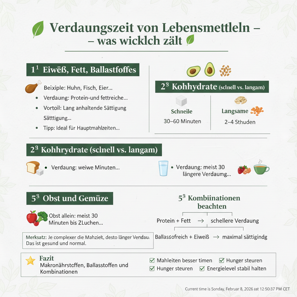 Die Verdauungszeit hängt von Makronährstoffen, Ballaststoffen und Kombinationen ab. Wer die Prinzipien kennt, kann: